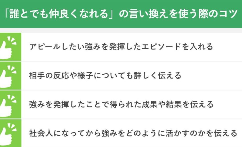 誰とでも仲良くなれる能力の言い換えは、そのスキルを効果的に表現するために重要です。この能力を具体的に伝えることで、他者とのコミュニケーションが円滑になり、関係構築が進みます。言い換えのスキルは、日常生活や職場での対人関係を豊かにする要素です。