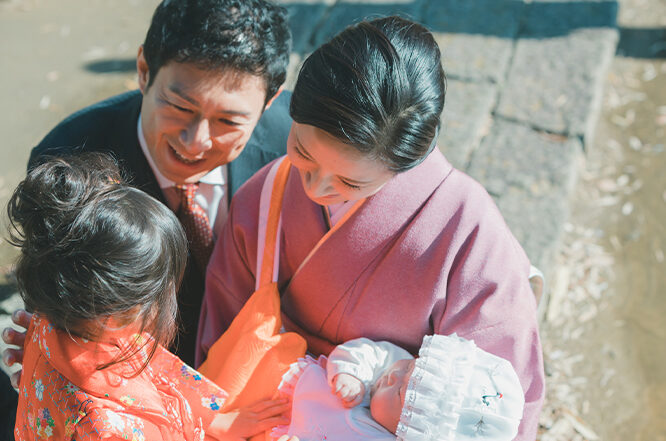 - 神社の背景:神社の美しい風景を背景にして、赤ちゃんを抱いた親や家族全員の写真を撮ります。