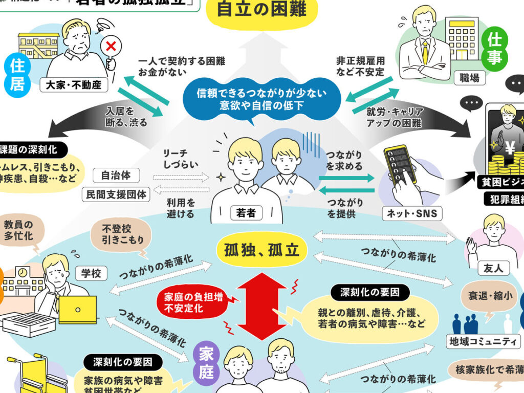 - 生活環境の影響。都市部での孤立感や、長時間の労働によるコミュニケーションの不足が孤独を助長する。