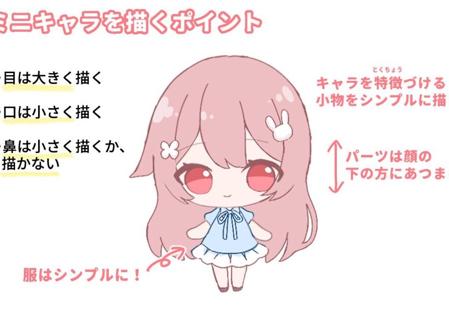 - 目の大きさ:大きくてキュートな目を描くことで、感情表現が豊かになる。