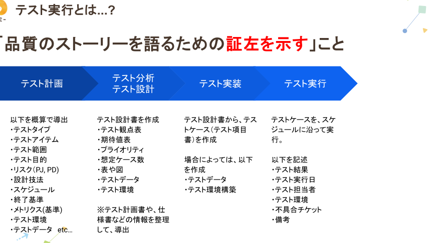 テストの実施は、計画や設計を基に行う重要なプロセスです。具体的なステップには以下の内容が含まれます。