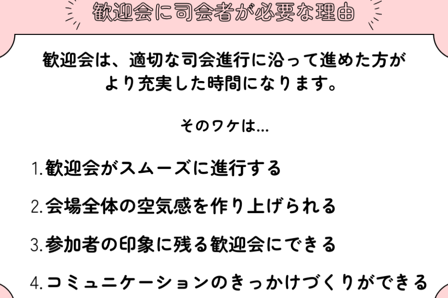 歓迎会には明確な目的があり、新しい仲間を快適に迎え入れるための仕組みが存在する。まず第一に、新メンバーの紹介が重要です。そのため、各参加者が自己紹介を通じて新しさを感じられる。自己紹介により、参加者同士の距離が縮まる効果もある。