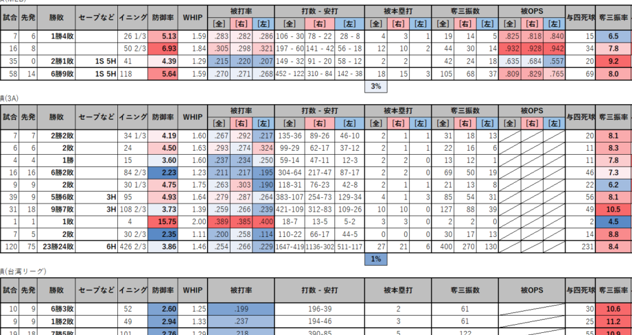 各投手のシーズン成績は、ピッチャーとしての能力を数値で示しています。以下の表は、今シーズンの主な成績をまとめたものです。