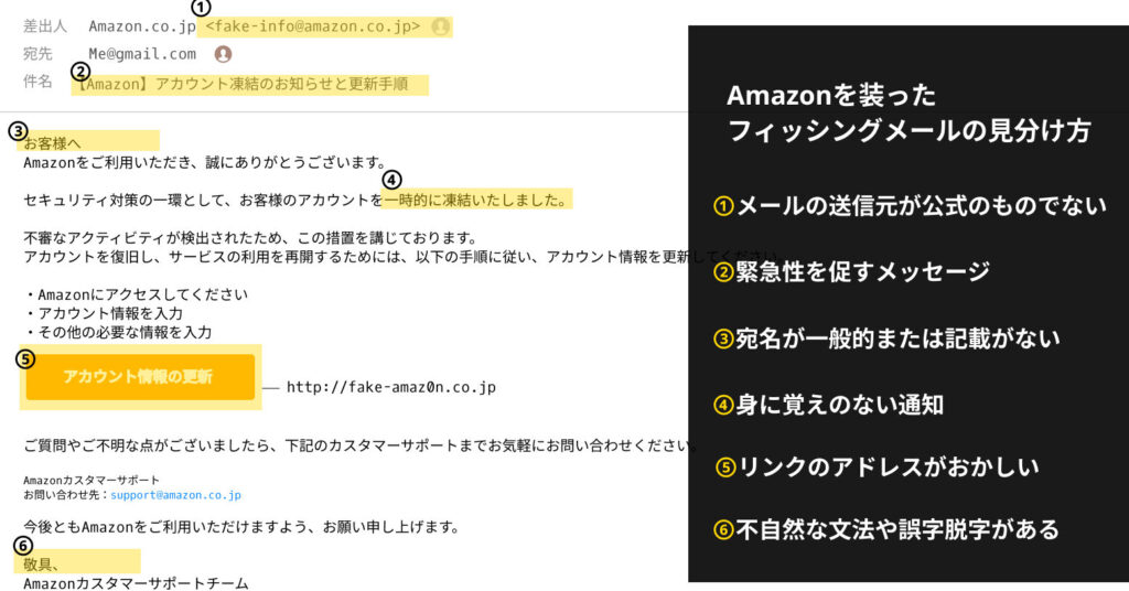 - 送信者のメールアドレスが公式と異なる: 公式のアドレスではなく、似たような表記を用いていることが多いです。