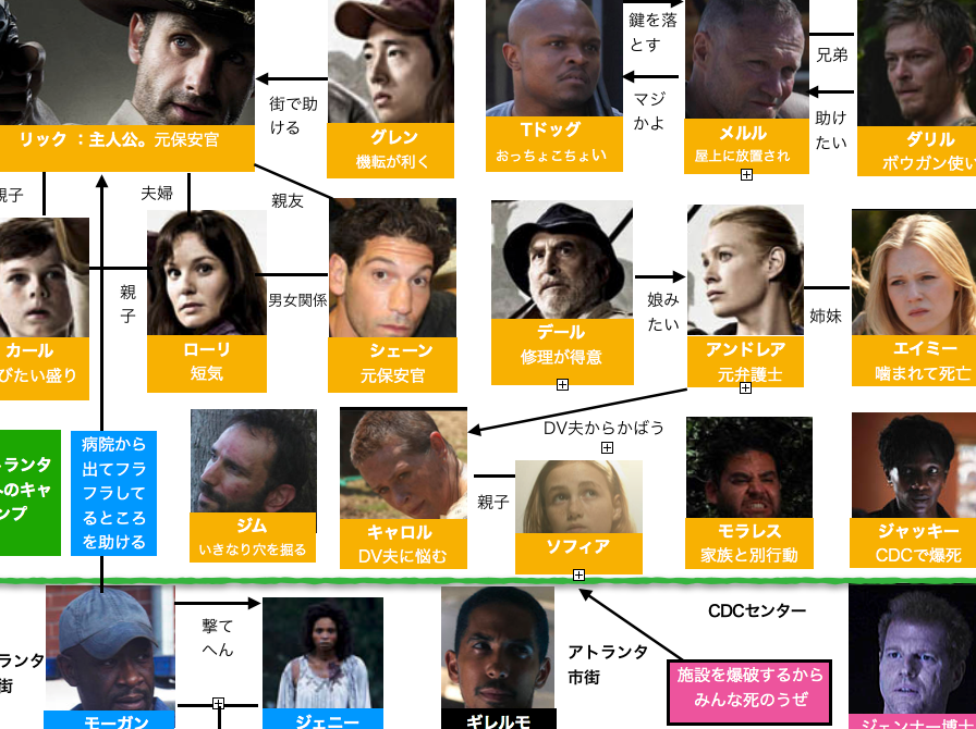 - リック・グライムス: 物語の中心人物で、元保安官。彼はサバイバル技術の持ち主であり、リーダーシップを発揮します。