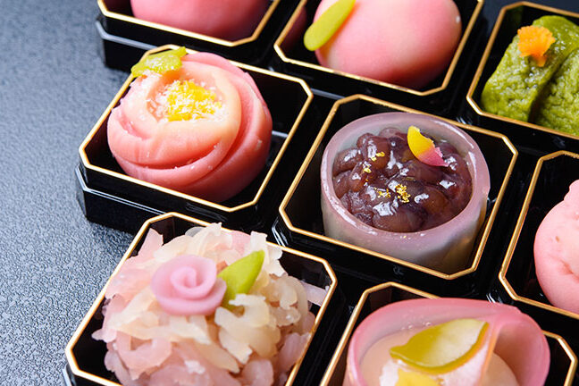 これらの和菓子は、見た目が華やかで、彩り豊かな盛り付けが特徴です。伝統的な行事や季節を感じさせる要素も多く含まれています。