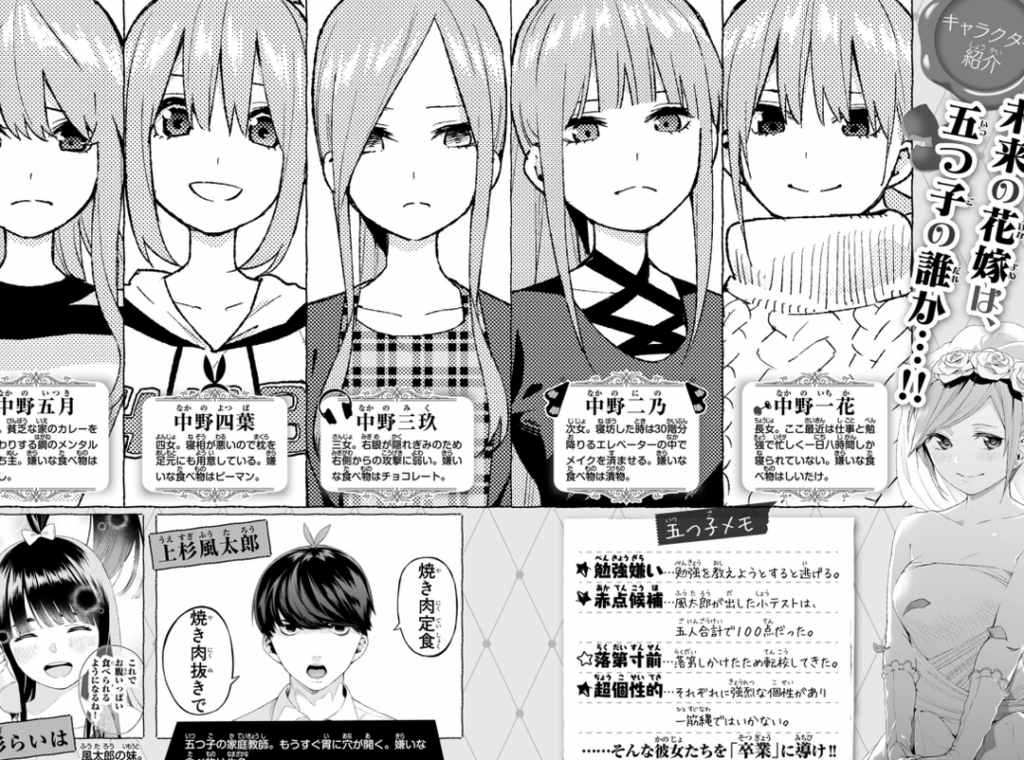 『五等分の花嫁』の結末では、主人公である風太郎が五つ子の中から誰と結婚するかが大きなテーマです。物語では、各姉妹とのエピソードが展開され、彼らとの絆が深まります。その中で、風太郎はそれぞれの姉妹の個性や特徴を理解し、彼女たちとの関係を築いてきました。